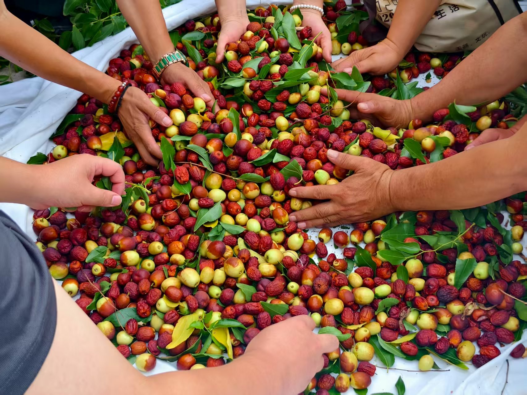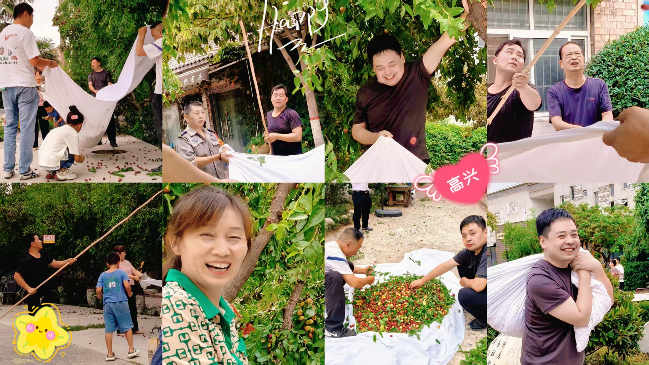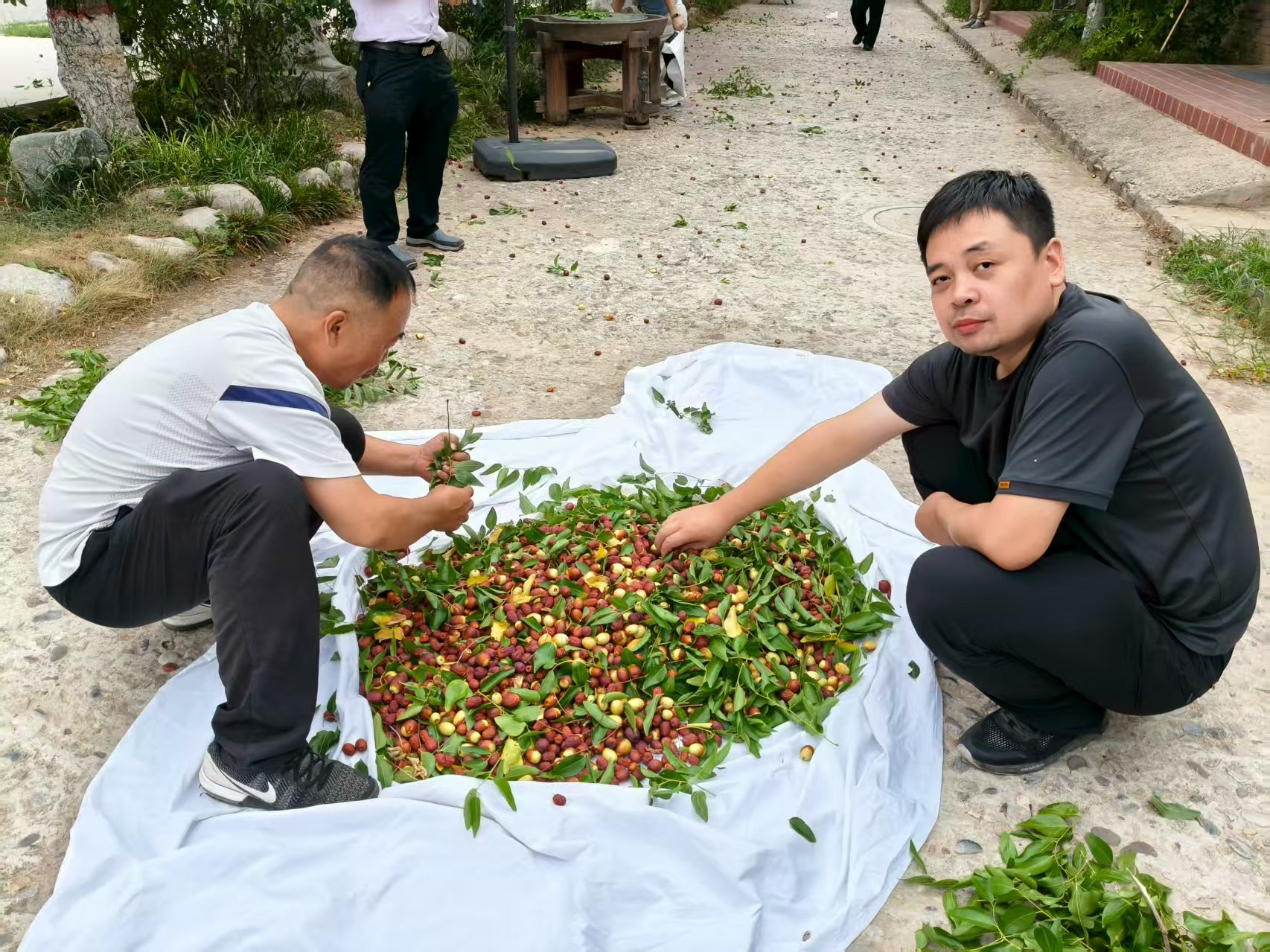 员工们手持竹竿,轻巧地敲打着枝头,红彤彤的枣子便如雨点般落下。有人利落地敲出枝头高处的果实,有人在树下细心拾捡,每个人的脸上都洋溢着收获的喜悦。这一刻,工作的疲惫悄然消散,取而代之的是孩童般的纯真笑容。